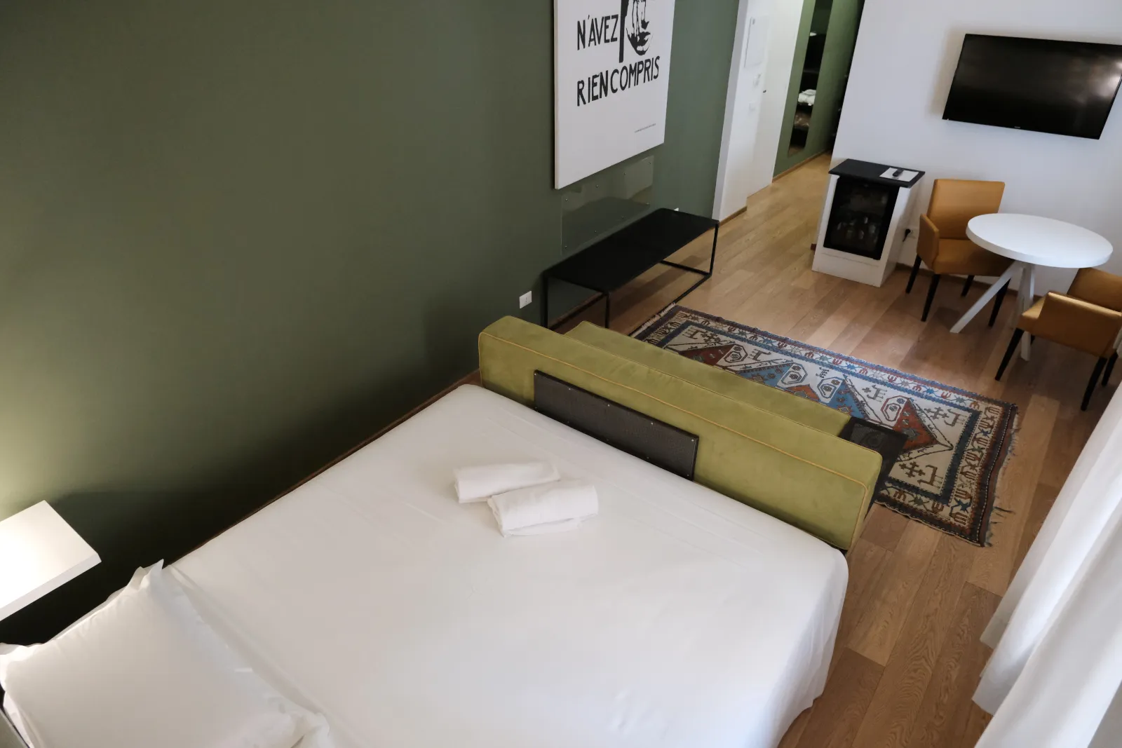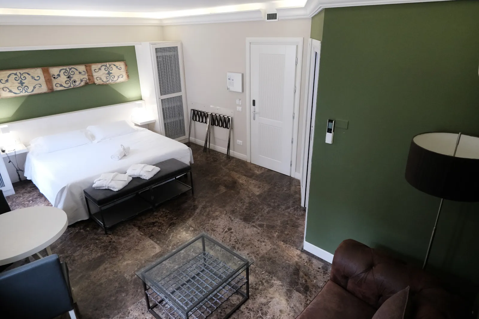 Ampia, elegante e accogliente, la Junior Suite del Quintocanto Hotel & SPA di Palermo offre spazi generosi e un raffinato angolo salotto con divano e tavolino in ferro battuto e vetro, perfetto per rilassarsi dopo una giornata in città o per lavorare in totale comfort.